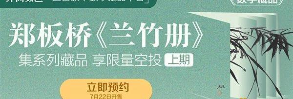 本次《蘭竹冊》系列藏品共有6款,分別為蘭竹、瓶菊、蘭竹石、竹石、蒲草、雙蘭,每款限量出售1000份,用戶購買此系列4款及以上,還將獲得鄭板橋題字的《蘭竹冊》“金農小詩”空投。本次發售的《蘭竹冊》系列藏品分為上中下三期,上期為蘭竹和瓶菊,于7月22日11時正式發售。目前,預約抽簽也已同步開啟,用戶在預約期間支付預付金參與抽簽,中簽即可獲得藏品。