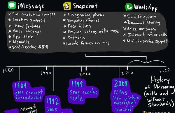 回想一下iMessage這些年來的變化。早期的iMessage和SMS沒有多大區別。但現在,它具有極其豐富的功能特性,比如已讀回執、圖片庫、面部濾鏡和Memojis、App應用商店、語音備忘錄,等等,數不勝數。Snapchat、Messenger、WhatsApp等其他很多專有短信平臺也是如此。這些平臺能夠達到這么高的創新水平和這么快的創新速度,唯一的辦法就是在SMS標準之外進行研發創建。
