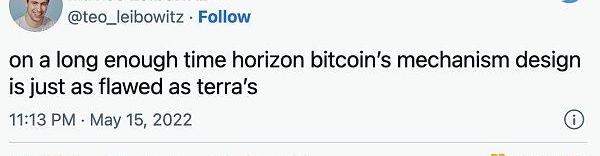 “在足夠長的時間范圍內,比特幣的機制設計與Terra的一樣有缺陷。”