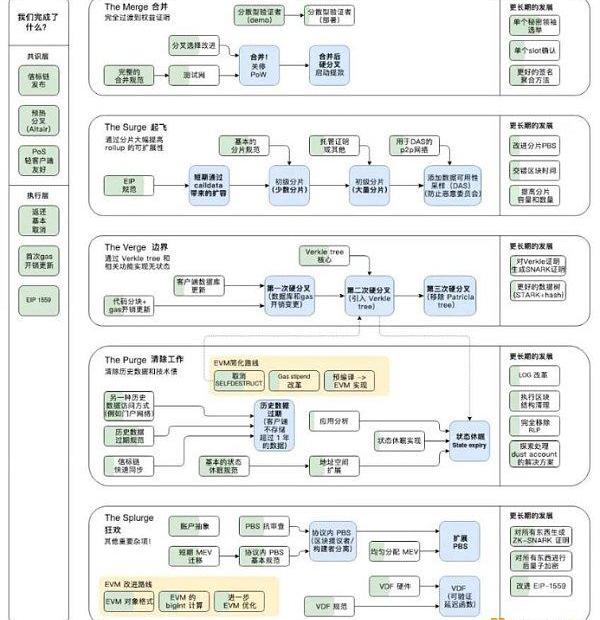 模塊化區塊鏈指的是將區塊鏈的執行層,共識層,數據可用性層等分離,以實現區塊鏈的可擴展性和性能的提升。以太坊在合并之前運行的主網鏈是執行層,負責運行虛擬機來實現世界狀態的改變以及智能合約的執行,也就是運行Dapp和處理交易的地方。而合并后beacon?chain則作為共識層來替換掉現有的PoW共識機制負責以太坊新區塊的出塊權選擇,不同于之前以太坊的挖礦方式,合并以后的以太坊不再需要重復計算哈希函數,而是通過隨機挑選驗證節點的方式來打包出塊,并通過將區塊提議者和打包者分離的方式進一步防止作惡,至此,共識層與執行層實現分離。