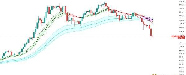 BTC自前期跌破上方軌道支撐后便一路下滑,直至后面出現加速,我們看紅色曲線即將下穿藍色曲線,可以看下之前歷史走勢。