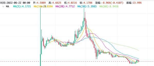ape:日線級別看,如上圖所示,幣價從4月30日開始便一路陰跌,較最高點累計跌幅已高達80%+,目前仍未出現明確的止跌信號。