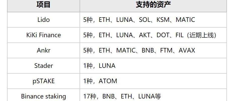 目前,去中心化Staking協議處于發展初期,因此首先支持的普遍都是熱門公鏈。其中,Lido支持ETH、LUNA、SOL在內的5種中資產,Ankr支持ETH、MATIC、BNB在內的5種中資產,Stader和pSTAKE目前均只支持1種資產,KiKiFinance支持ETH、LUNA、AKT、DOT以及即將上線的FIL這5種資產。