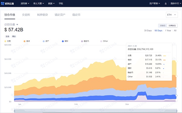 以太坊上的DeFi協議在突破600億美元后有所回落。同時我們也可以看到,當前以太坊上的DeFi分布詳情。