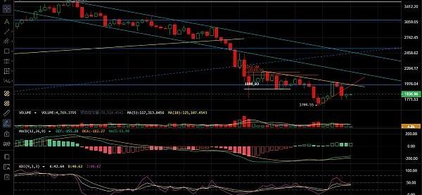 以太坊走勢比大餅弱,白盤行情整體處于震蕩走勢,多空博弈較為激烈,昨日給出1860附近做空激進的目前還是獲利狀態,可以留一部分接著下看,四小時來看多頭上行受阻收長上影,MACD空頭縮量上行,KDJ三線向上延伸,短期處于震蕩拉鋸,日線連陰MA7MA14壓制較強,整體形態結構偏向空頭,思路上高空為主,以太坊:1878-1890附近進空,目標1853-1810-1780附近,補倉1915-1920附近,止損1935