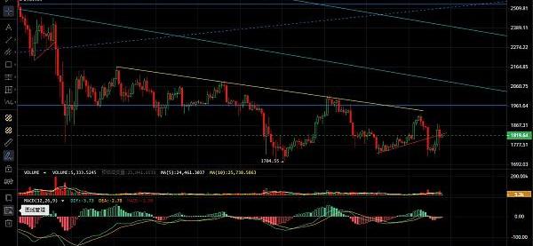 行情總是在后半夜出現,昨日白盤斷崖式下跌至1725一線,白盤呈震蕩走勢,二次未破前低凌晨走出一波拉升,觸及前期支撐轉壓力的趨勢線承壓回落,多空來回插針,明眼可見以太坊整體結構比大餅弱勢,幅圖指標雙線粘合震蕩,技術面來看行情五五開沒有明確方向,整體依舊處于大區間震蕩,后市個人更看好向下破位,日內操作思路逢高做空,上方壓力1830-1870,下方支撐1760-1700