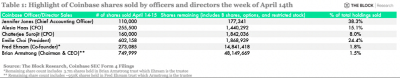 那么 Coinbase 高管團隊在 COIN 交易首周到底賣出了多少股票?