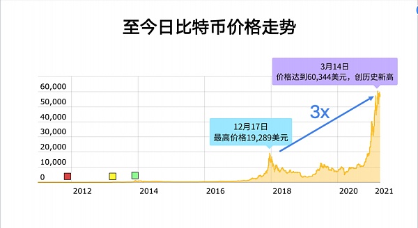 這是比特幣2011年的6月的價格趨勢。如果你2011年暑假看到這個價格,就會感覺它漲得這么兇了。后來過了一年零八個月后,2013年的八月又回到這個價格,那個時候價格是30美元。所以那個時候你們見到后有買過嗎?有沒有13年買過比特幣的?這張圖片代表如果你只是看價格過去的話,你會看得到它漲得很兇,不管是最近的2021年還是過去的2017年還是2013年。