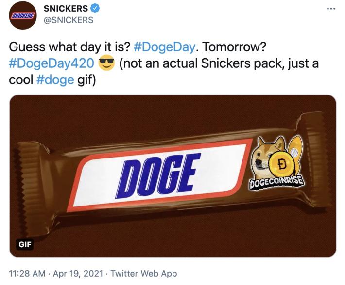 4月19日,士力架巧克力棒的官方推特賬號發布了帶有#DogeDay標簽的推文,其中包含以狗狗幣為主題的包裝圖。士力架公司還沒有為狗狗幣投資人推出限量版士力架巧克力棒,并稱這只是一個“很酷的GIF圖”。