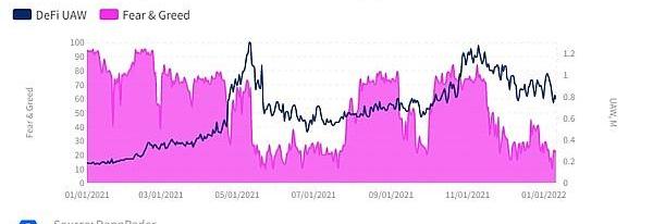 詳細觀察FGI和DeFi用戶之間的相關性,我們可以看到DeFi的使用量在11月飆升至125萬的歷史新高——與AVAX、SOL、和LUNA的價格飆升相關。隨著加密市場在年底降溫,使用量再次降至100萬UAW以下。