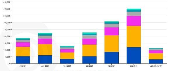 在分析首選連接設備時,出現了另一個令人興奮的指標。盡管由于RADAR的推出而增加了大量訪問者,但用戶仍有53%左右的時間通過移動設備連接。雖然大多數用戶出于安全原因更喜歡使用桌面版本的錢包,但桌面設備只帶來了46%的流量。這可能會導致一種重要的行為趨勢---2022年將成為區塊鏈游戲的重頭戲,這一趨勢需要密切關注,因為手機錢包和移動區塊鏈游戲有望在2022年實現巨大飛躍。