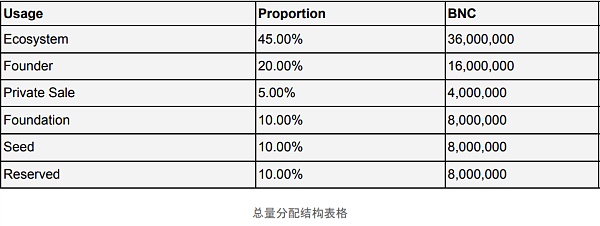 為保障Bifrost功能開發、上線及生態系統的發展,不同部分的BNC分配將有不同的鎖倉時間,團隊部分的BNC也將在流通當天之后半年開始線性釋放,持續兩年時間解鎖完畢,具體情況如下: