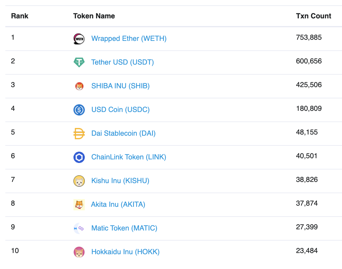 如果進一步觀察Gas消耗量最大的Uniswap?V2的交易情況,可以發現,當前,SHIB、AKITA、KISHU、HOKK等動物幣的交易量已經進入前10。其中交易量最高的SHIB,交易量達到了10.8億美元左右,僅次于WETH。