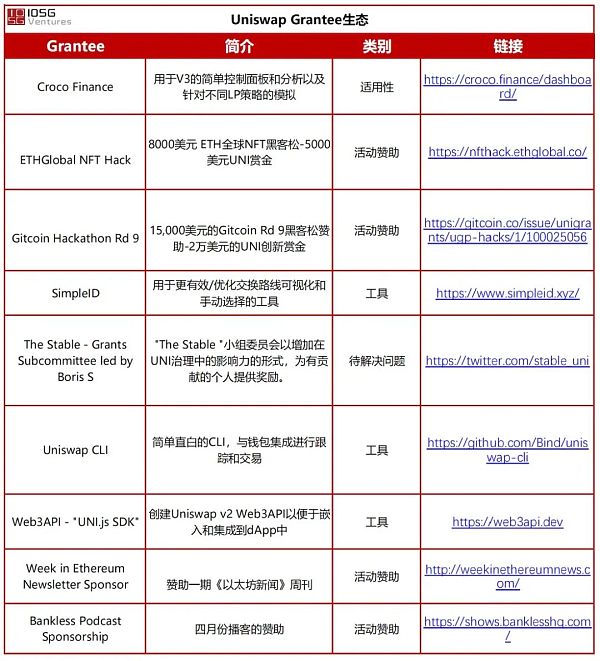 另外,Uniswap生態也不容小覷。以Grants計劃為例,該計劃將大量資源用于創建關鍵的開發者工具,添加高質量數據以及在Uniswap生態圈啟動關鍵服務。
