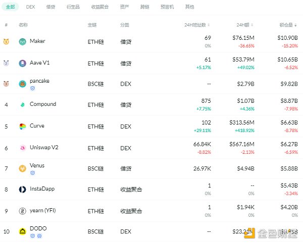 DeFi項目鎖定資產前十排名及鎖倉量,數據來源:Debank
