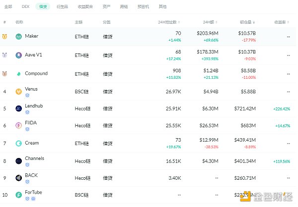 鎖倉量排名前十的借貸平臺 排名來源:DeFibox