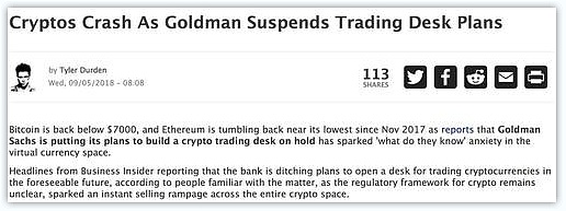 2018年9月,高盛宣布暫停其加密貨幣交易柜臺計劃之際,加密市場崩潰