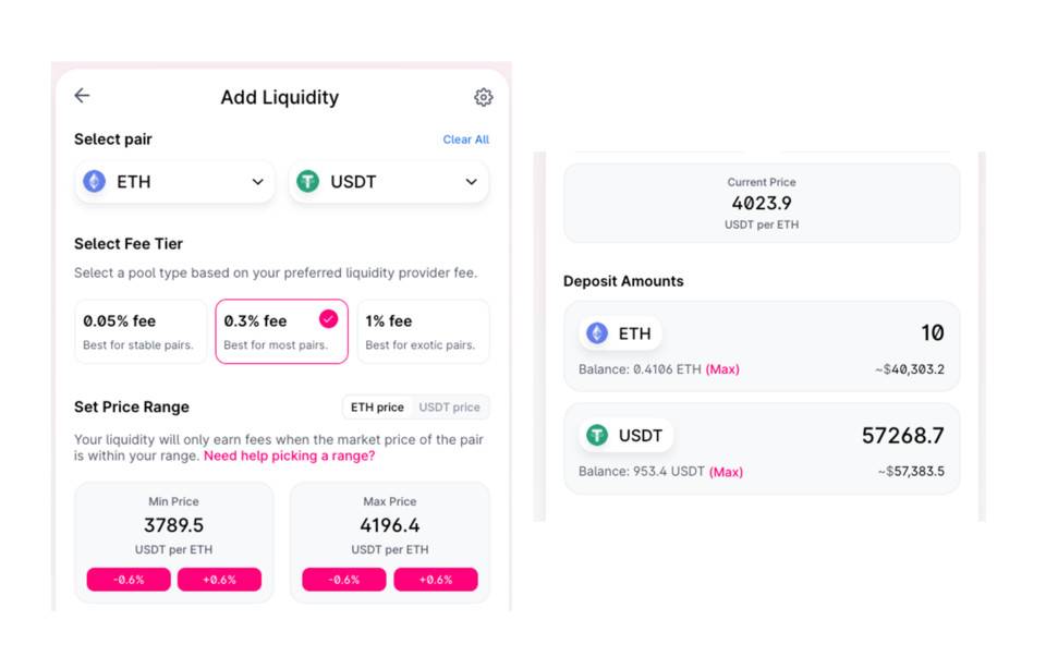 在 Uniswap V3 中,交易費用和價格區間是 LP 必須指定的參數,如以下用戶 UI 面板所示。