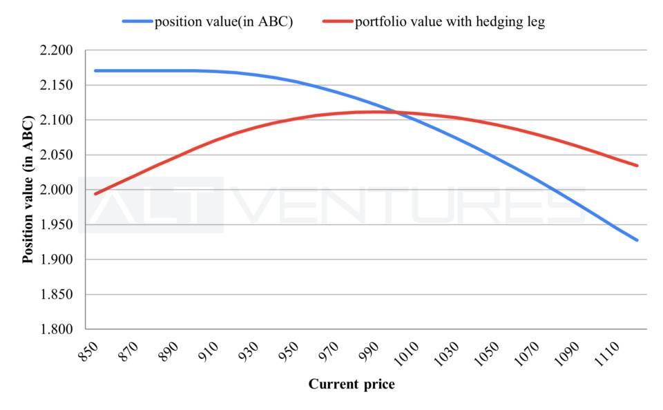 當 ABC 價格上漲時,資金池中的 ABC 逐漸轉換為 USDT,直到交易者的頭寸中不再有 ABC 為止。 這種情況下交易者實際上是在做多 ABC,為了對沖該風險,交易者可以從一開始就賣空 1 ABC。 這樣整個投資組合將是(1)池中的頭寸+ (2) 1 ABC 的做空對沖