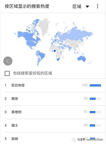 根據谷歌的搜索指數,尼日利亞已經在超過6個月的時間里,排名“bitcoin”搜索熱度第一。而在前五名中有三個非洲國家。有數據顯示,10.7%的南非人、7%到8%的加納和尼日利亞人持有加密貨幣。