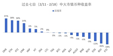 截至2月18日周二收盤(UTC時間),中大市值幣種仍有部分保持強勢,在短暫回調后反彈至前期高點。OKB領漲21%,之前OKEX投研較為看好的ETH上漲18%。前期炒作的熱點 - 減產幣種普遍表現不佳,ETC大跌18%,BSV跌16%。