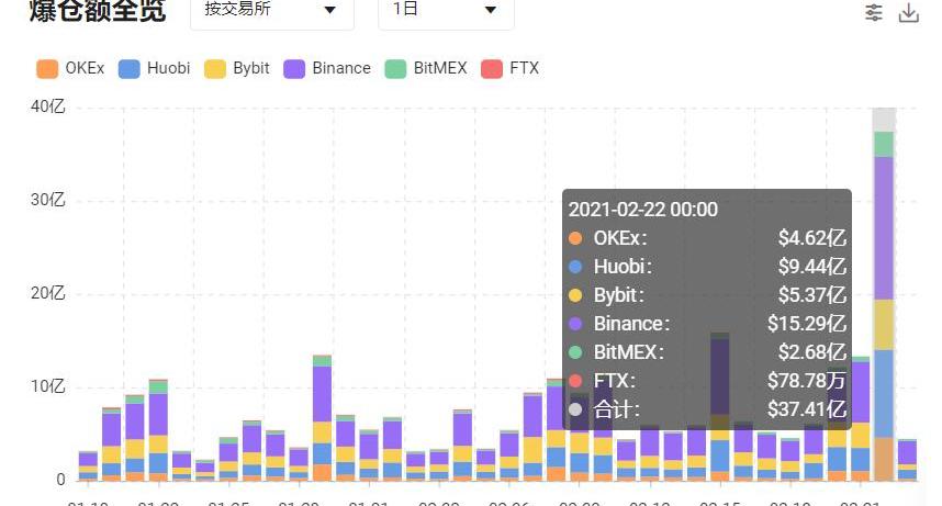 中心化交易所,據QKL123數據顯示,24小時爆倉量37.41億美元,已經超過去年“312”數據。