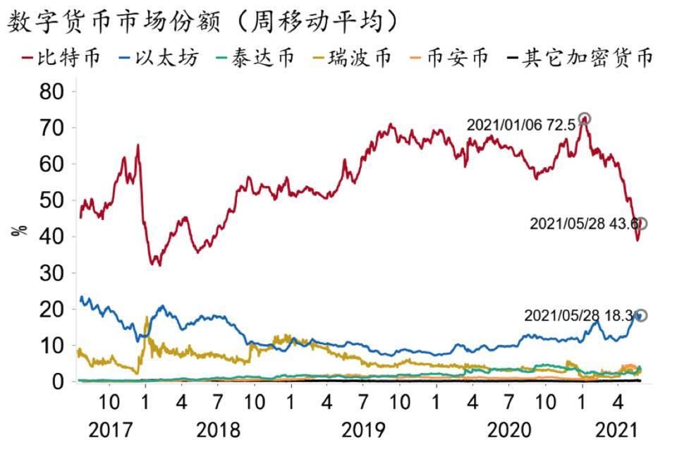 進入 5 月,今年以來一路高歌猛進的比特幣出現崩盤式行情。5 月 11 日,特斯拉老板埃隆·馬斯克宣布中止接受比特幣購車付款計劃,比特幣和其他加密貨幣價格應聲大跌,一周時間內下挫三成;由于幣圈(挖幣、炒幣)在中國異常活躍,從保護投資者利益出發,5 月 18 日中國互聯網金融協會等三家行業協會發文,要求成員機構不得開展與虛擬貨幣相關的業務;5 月 21 日,國務院金穩委第五十一次會議進一步明確「打擊比特幣挖礦和交易行為」。至此,幣圈風云突變,比特幣價格從 4 月的歷史高點下跌幅度最多接近五成。