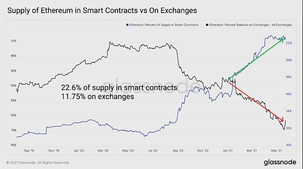在智能合約中的以太坊供應比例一直非常健康,在整個大跌的過程中,23%以上的供應仍在合約中。交易所的供應量從11.13%躍升至11.75%。
