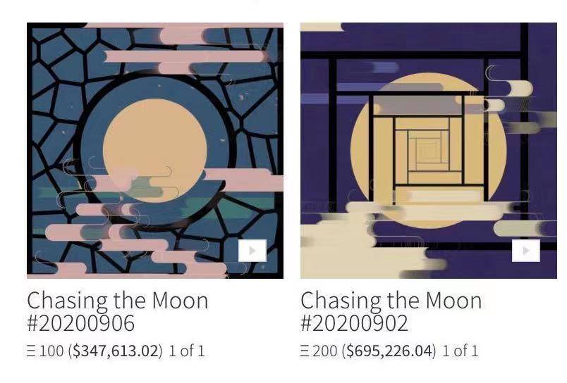 她第一次拍賣的兩幅 NFT 作品中所有元素如古代中式建筑的窗欞和動態的煙霞都是由算法生成的,在 NFT 交易平臺 Makersplace 掛出后,均賣出了 0.5 個以太幣(按照當時價格,約 200 美元)。更讓她受到鼓舞的是,她后來知道,買走這兩幅畫的藏家是圈內知名人物。