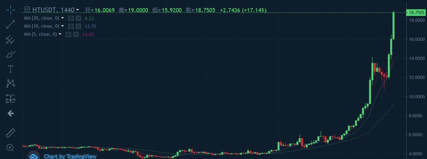 HT從5.5美元來一直走高,一路突破18美元,今天氣漲勢不休,正式站上19美元高點。創下歷史新高。HT今日漲幅超35%,近7日漲幅42.72%,現徘徊于18.8美元附近。