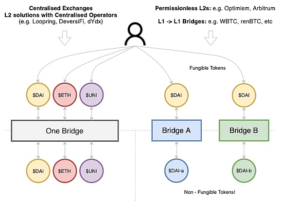 在此示例中,每個跨鏈橋(橋A和橋B)將在子鏈上創建其自己的DAI“版本”,這些DAI的不同版本將不可替代(類似于wBTC與renBTC)。此外,如果MakerDAO社區無法控制DAI品牌的敘述,最終用戶可能會在自己的錢包中擁有許多不同的DAI不可替代版本,從而造成潛在的混亂。
