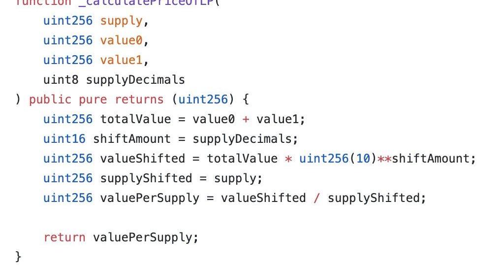 對于抵押LP借穩定幣這個邏輯而言最關鍵的就是LP的價格,價格估低了倒還好,只是影響LP資產的使用效率,如果是價格給估高了,則會給項目帶來非常大的損失。WarpFinance中計算LP價格的代碼正如上文所示的公式一樣: