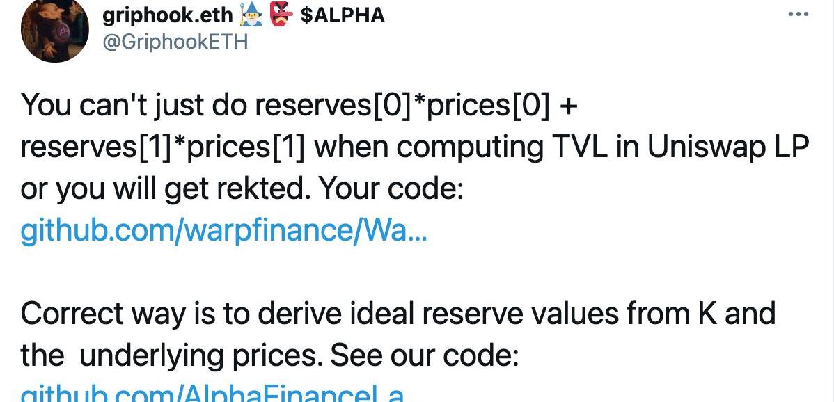 在WarpFinance被黑客攻擊后,AlphaFinanceLab在twitter上指出了WarpFinance計算LP價格的問題: