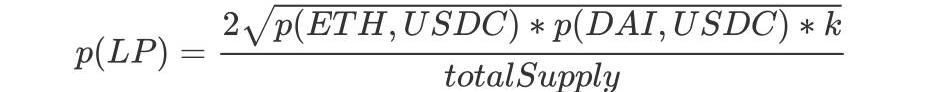 在黑客從WarpFinance借穩定幣之前只對ETH-DAI池進行了賣ETH操作,這個操作不會影響totalSupply。另外一方面在WarpFinance的實現中p(token)的價格采用的是Uniswap的X-USDC池子ETH-USDC和DAI-USDC的代幣價格,而且是時間加權平均價(TWP),這個價格是黑客沒法操控的。再加上price(DAI,USDC)的價格可以認為是1,因此LP的價格公式(忽略掉totalSupply)可以簡化為: