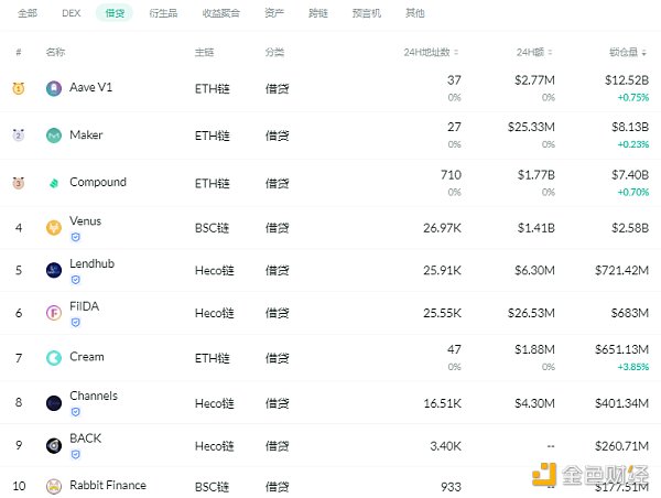 鎖倉量排名前十的借貸平臺 排名來源:DeFibox