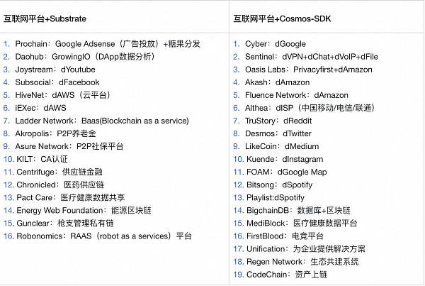為了觀察,我們暫且將Appchain分為基于Substrate開發和基于Cosmos-SDK開發兩種,其中我們又將Appchain分為加密協議再創新與互聯網平臺再創新兩種(PS:僅代表個人粗略分類,若有錯誤請及時聯系修改)。