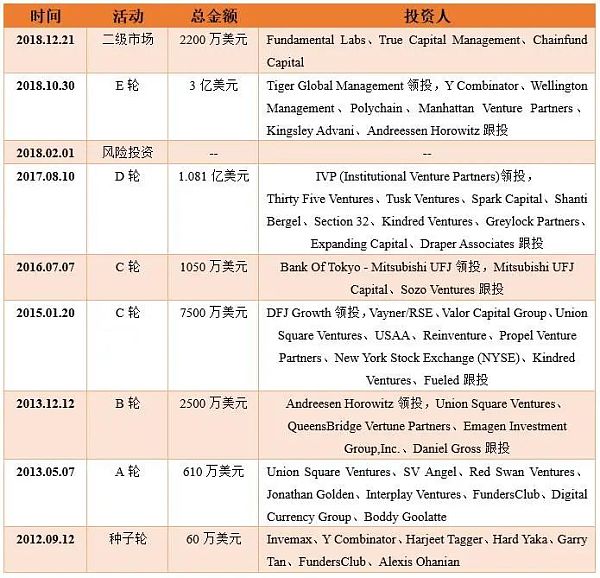 2018年10月,Coinbase開啟E輪融資,由Tiger Global Management領投,Y Combinator Continuity、Wellington Management等跟投,融資規模達3億美元。這些資金將完善Coinbase現有數字資產業務并支持業務擴張計劃,包括發展全球區塊鏈業務、增加面向機構的數字資產服務、增加支持的數字資產種類等。