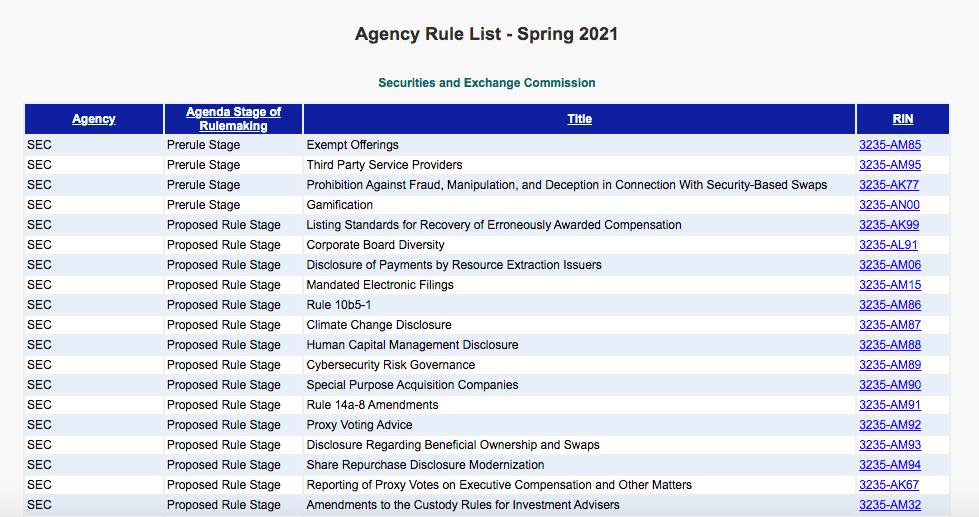 然而,在監管機構發布的新議程中并沒有加密貨幣,他們指出,優先考慮為特殊目的收購公司(即 SPAC)制定和敲定規則;賣空披露;貨幣市場改革;Robinhood 等交易平臺的游戲化以及一系列其他問題。