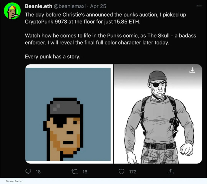 不過,收藏家們不僅是被動地持有 CryptoPunk,還開始相互合作,創作由 CryptoPunk 角色藝術啟發出的新故事,使他們的CryptoPunk「擁有生命」。