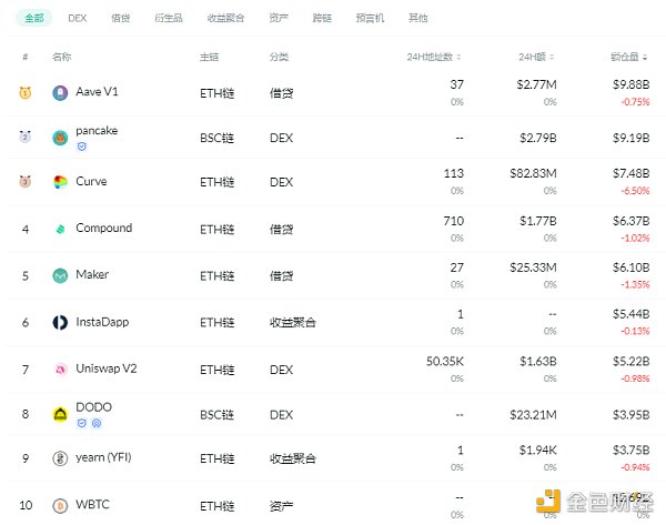 DeFi項目鎖定資產前十排名及鎖倉量,數據來源:Debank