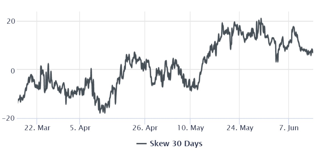 上圖證實了包括套利者和市場做市商在內的頂級交易員,目前對比特幣價格感到不安,因為中性至看跌的看跌期權溢價更高。不過,目前7%的正偏態(positive skew)遠低于5月下旬出現的20%的“夸張恐懼”。