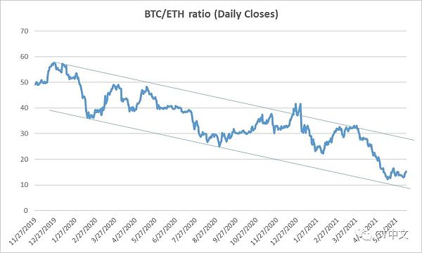 數據顯示,5月19日崩盤后,比特幣和以太坊之間的巨大價格差異開始趨于平緩。Lifshitz稱這是比特幣將比以太坊更有價值的又一個跡象。
