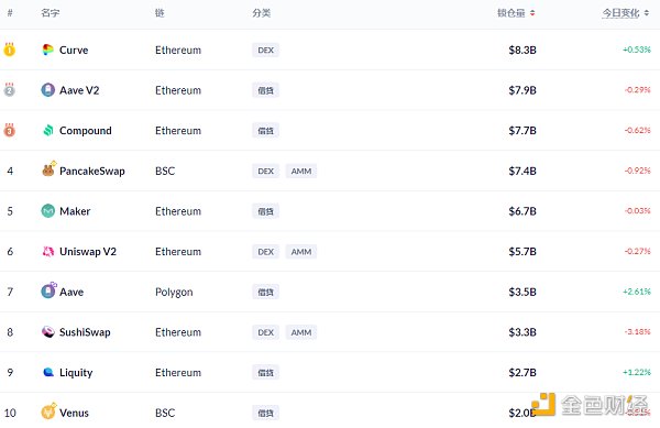 鎖倉量排名前十的借貸平臺 排名來源:DeFibox