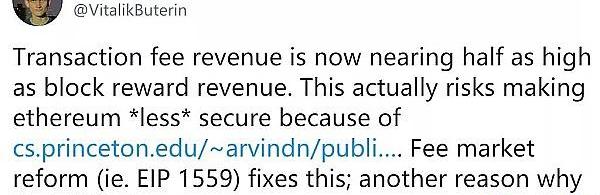 以太坊改進提案EIP-1559由Vitalik于2019年提出的,他發推特稱:目前以太坊礦工的收入結構中,交易費收入已接近區塊獎勵的一半,這可能威脅以太坊的安全性。