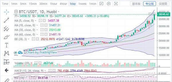 比特幣日內行情延續新高之勢,晚間價格再上行刷新歷史高點,行情破位觸及38000一線,短期多空出現膠著,但是大方向上行姿態并未改變,后續仍有進一步上行的可能。