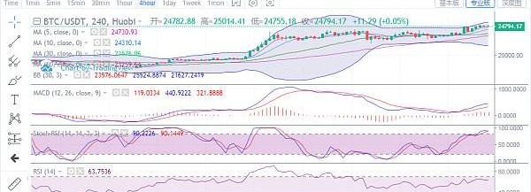 比特幣早間走了一波沖高回落,高位觸及25045位置,刷新年度新高,午間價格再次上探,未能打破上方壓制,探至25014位置后承壓回落,目前價格運行在24930附近