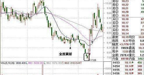 3、金屋藏嬌:股價經過長期下跌,股價反而選擇了向下突破,呈帶量加速之勢,但最后一根陰線留下長長的下影線,表明底部承接有力。第二天,股價低開低走,但不再創新低,成交量萎縮,表明拋盤窮盡。