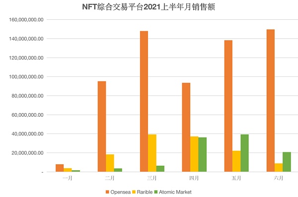 從下圖的每月銷售額我們可以看出,Opensea在上半年每月的銷售額在綜合交易平臺里排名都是第一,并在三月跟六月都達到了一億四千萬美元的銷售額巔峰,大幅度超過其它的綜合交易平臺。