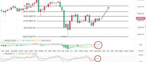目前從幣價走勢來看,幣價經過昨天一天的瀑布之后,慢慢進入了調整期,但是我們該有的利潤還是一樣會有。目前幣價處于斐波那契黃金分割線61.8%上方。可以看到,正個幣價呈緩慢上升的姿態。另外MACD也已經形成金叉。紅柱動能正在開始逐漸發力。KDJ三線,也已經開口朝上發散運行狀態。因此,目前我們的思路要以低位多單為主。