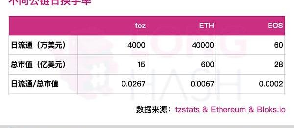 另外通過bloks.io可以看到EOS的數據,曾被寄予厚望的公鏈3.0,熱度持續下降,如今市值排名被擠出10名開外,對應的是日流通量下降嚴重,可見日流通金額也是衡量主網價值的重要參考。三條公鏈對比來看,以太坊的全網流通量遙遙領先,不過tez相對流通市值占比反而有優勢,這和tez的Staking模型中需要頻繁轉移代幣有一定關系,不過Tezos的這一數據令人驚喜。